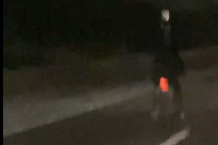 Terlihat pemotor menorobos jalan tol dengan kecepatan tinggi.
