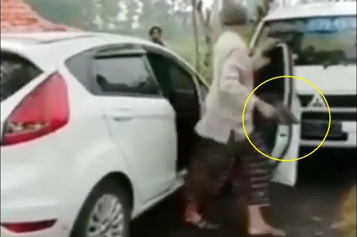 Seorang pengendara mobil city car tak terima diminta memundurkan kendaraannya saat berpapasan dengan kendaraan minibus di jalan sempit.