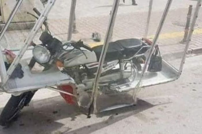 Motor ini dibubuhi dengan rangka dan kaca serta atap, membuat pemotor terlindungi layaknya sedang naik mobil.