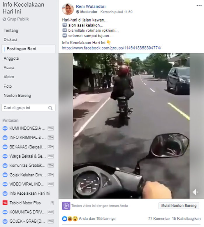 Sebuah video dibagikan akun Facebook Reni Wulandari ke grup Facebook Info Kecelakaan Hari Ini, Jumat (16/5/2020).