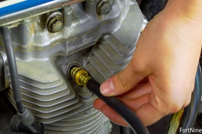 Kemudian, hubungkan selang pada lubang busi tadi dengan ujung selang yang terpasang pada ban motor yang kempes.