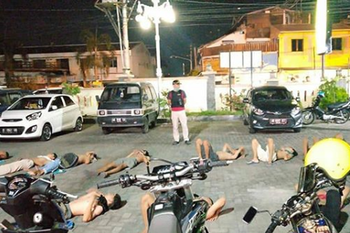 Sampai di kantor polisi, terlihat mereka dikumpulkan dan diberikan sanksi push-up.