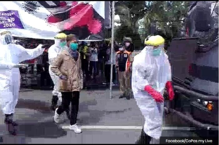 Petugas menggunakan APD ini bukan mau menangkap pemotor yang dicurigai sebagai ODP (Orang Dalam Pantauan) kena virus corona.