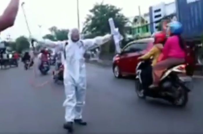 Gridmotor.id - Pemotor langsung kaget, kasus positif corona meroket, pria pakai APD lengkap teriak-teriak dijalanan.