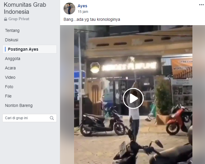 Sebuah video diunggah akun Facebook Ayes ke grup FB Komunitas Grab Indonesia, Minggu (24/5/2020).