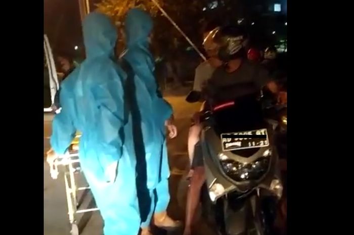 Satgas meminta pengendara yang diberhentikan untuk naik ke kasur karena akan dibawa ke rumah sakit.
