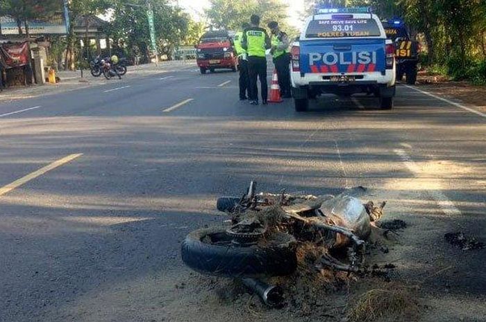 Gridmotor.id - Sebuah Yamaha Vixion hangus terbakar setelah menabrak seorang pejalan kaki hingga tewas di Tuban,Jawa Timur.
