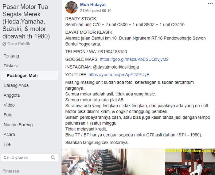 Pada postingan itu, motor lawas merek Honda yang Dayat jual, yakni 9 unit C70, 2 unit C800, 1 unit S90Z, dan 1 unit CG110.