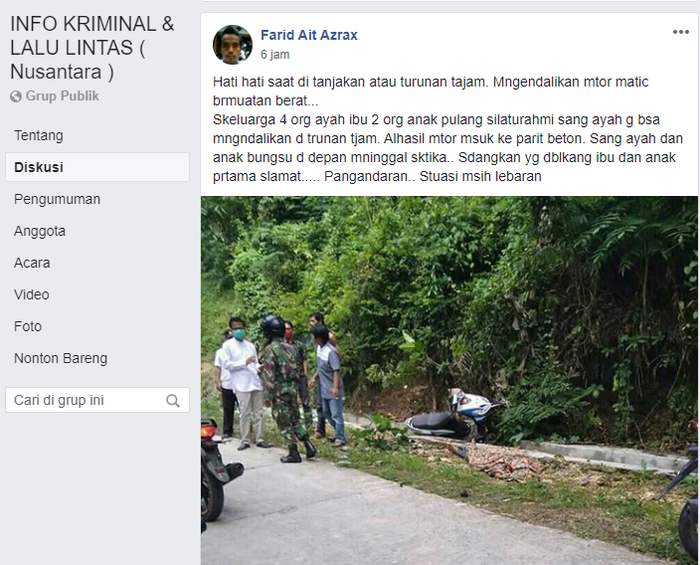 Kecelakaan itu dibagikan akun Facebook Farid Ait Azrax ke grup INFO KRIMINAL & LALU LINTAS (Nusantara), Selasa (26/5/2020).