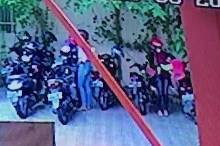 Terlihat keduanya mengambil helm yang ditaruh di spion motor oleh pemiliknya, kemudian langsung menaruhnya ke dalam sebuah tas.