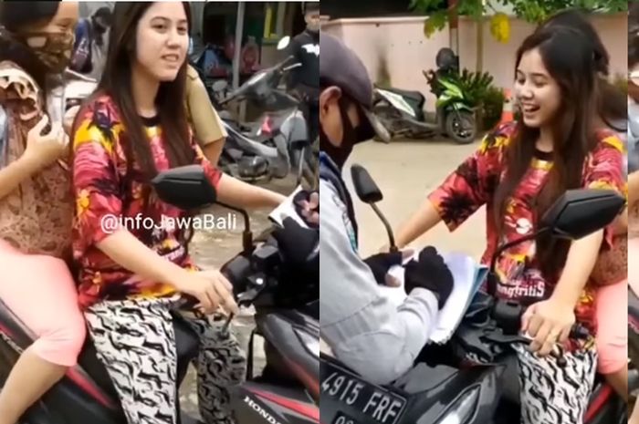 Belum diketahui waktu dan tempat cewek cakep naik motor Honda Vario ini dicegat petugas.