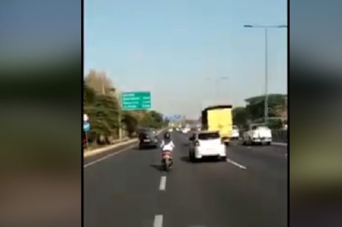 Seorang emak-emak naik Honda BeAT nekat masuk jalan tol.