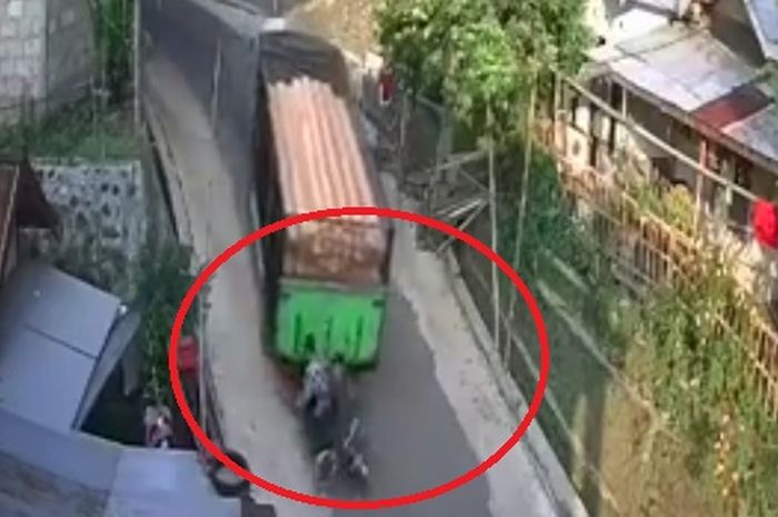 Kecelakaan pun terjadi. Motor dan pengendara tertabrak dan terlindas truk.