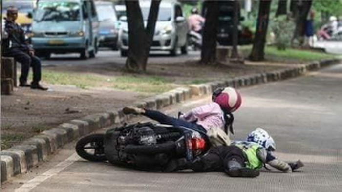 Akibatnya, malah anggota polisi dan pemotor emak-emak itu terjatuh di jalanan.