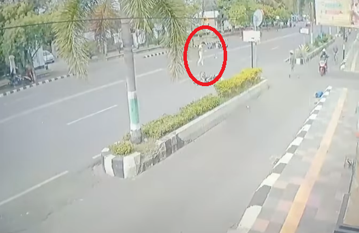 Meski ditabrak, pemotor yang mengenakan baju putih terlihat masih bisa bangun.