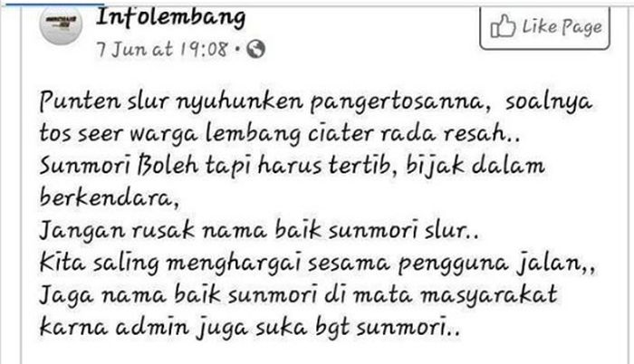 Dalam akun terebut admin menuliskan kira-kira isinya permintaan kepada bikers yang kerap sunmori di Lembang arah Ciater, Jawa Barat.