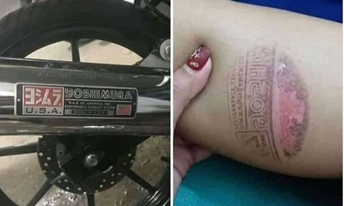 Loh ko bisa? Ini bukan tato yang sengaja dibuat, melainkan luka pada bagian kaki yang gak sengaja nempel di knalpot motor.