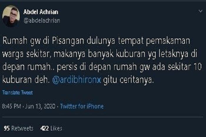 "Rumah gue di Pisangan dulunya tempat pemakaman warga sekitar, makanya banyak kuburan di depan rumah..persis di depan rumah gue ada sekitar 10 kuburan deh. @ardibhironx gitu ceritanya," jelas Abdel.