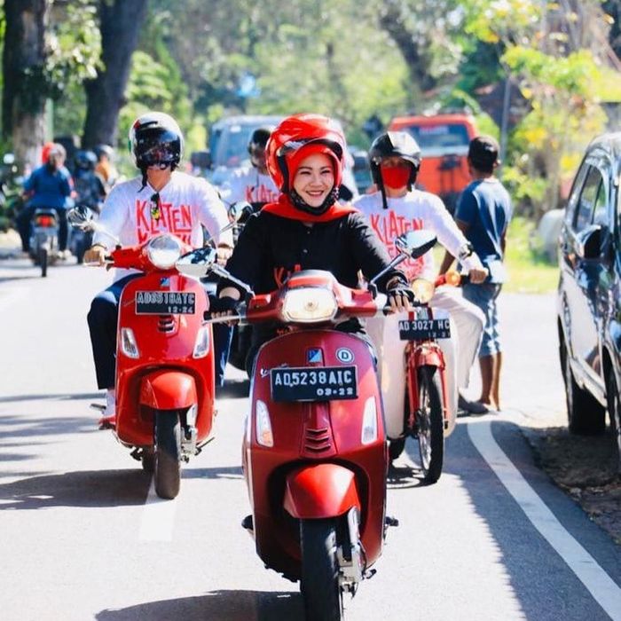 Terlihat menikmati nyemplak Vespa merah saat membagikan sembako di postingan instagram official dari Bupati Klaten ini @yani_sunarno.