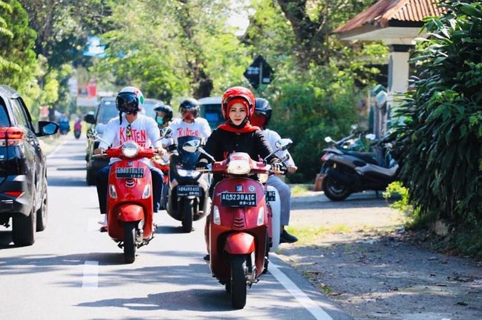Tentunya bupati cantik ini tidak sendirian dalam riding dengan Vespa merah ini, bersama dengan jajaran keliling ke beberapa lokasi untuk membagikan sembako.