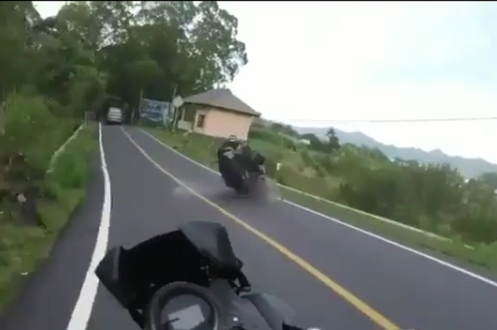 Saat memasuki sebuah tikungan, pemotor Yamaha NMAX yang berada di depan melebar dan memakan jalur berlawanan.