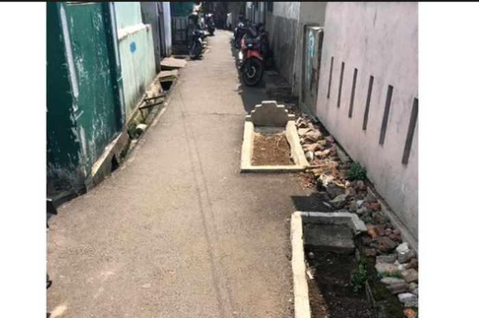 Makam yang berada di sebuah gang kecil itu terlihat berada sebaris dengan motor yang terparkir.
