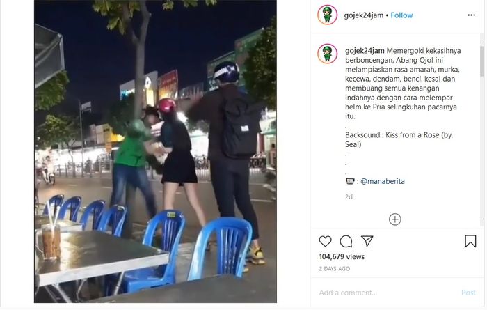 "Memergoki kekasihnya berboncengan, Abang Ojol ini melampiaskan rasa amarah, murka, kecewa, dendam, benci, kesal dan membuang semua kenangan indahnya dengan cara melempar helm ke Pria selingkuhan pacarnya itu," tulis akun tersebut.