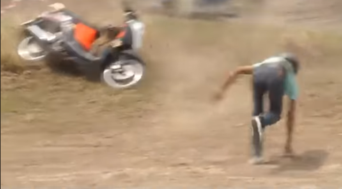 Karena ada obstacle seperti lompatan dan jalan bergelombang, para pembalap pun kewalahan.