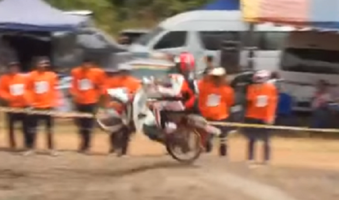 Karena ada lompatan, motor pun langsung terbang dan mendarat sempurna.
