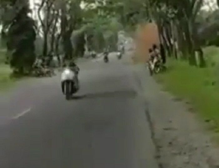 Kerasnya benturan membuat penonton enggak berkutik dan motor meluncur deras menghantam pohon di pinggir jalan.