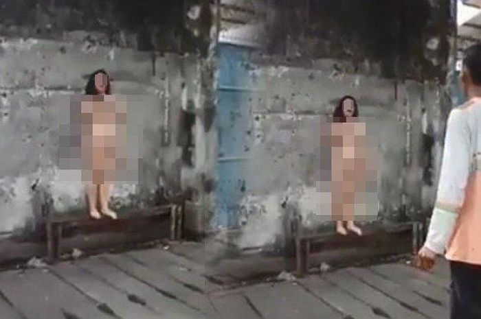 Tampak wanita yang tidak menggunakan busana itu berdiri pada sebuah bangku di pinggir jalan.