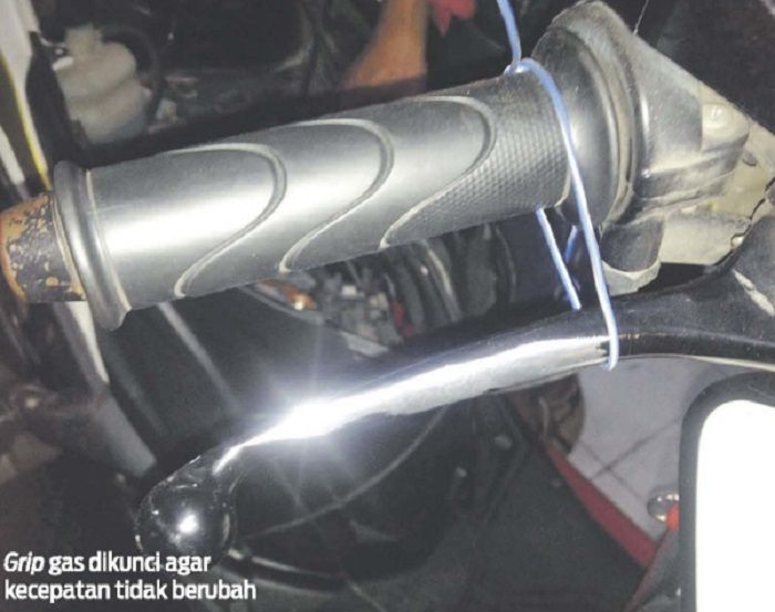 Biar kecepatan enggak berubah, grip gas dikunci menggunakan alat bantu tali.