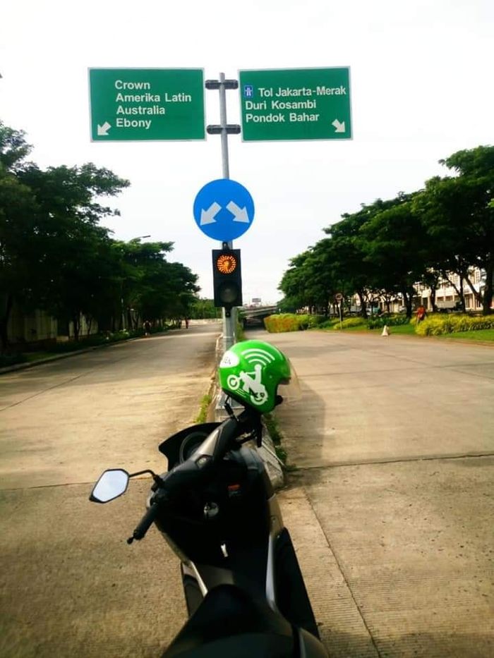 Foto tersebut menggambarkan motor ojol berada disebuah persimpangan.