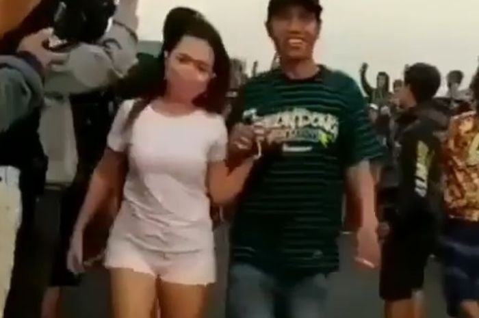 Terlihat cewek cantik tengah berjalan di kerumunan para penonton balap liar.