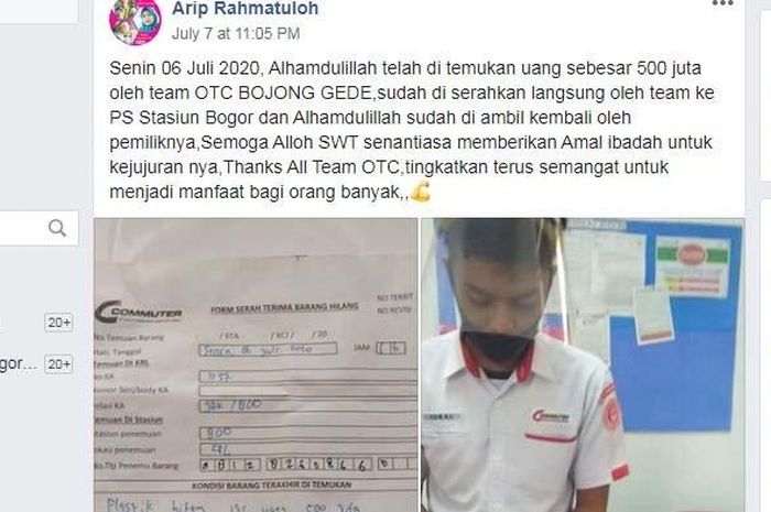Kejadian itu dibagikan oleh pemilik akun Facebook Arip Rahmatuloh ke grup KRL (COMMUTERLINE) Jabodetabek.