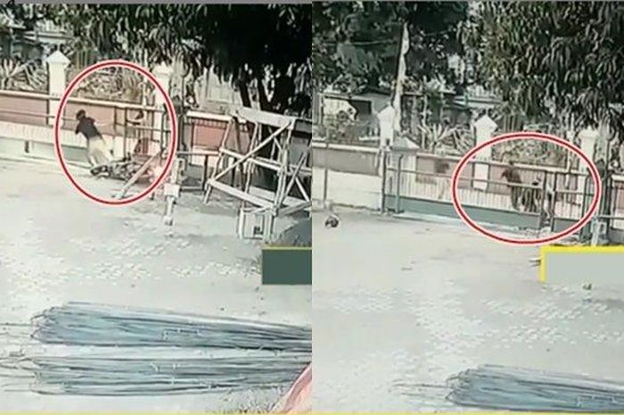 GridMotor.id - Mirip adegan sinetron, penjaga masjid dan maling kotak amal terlibat perkelahian, motor pelaku digencet pagar.
