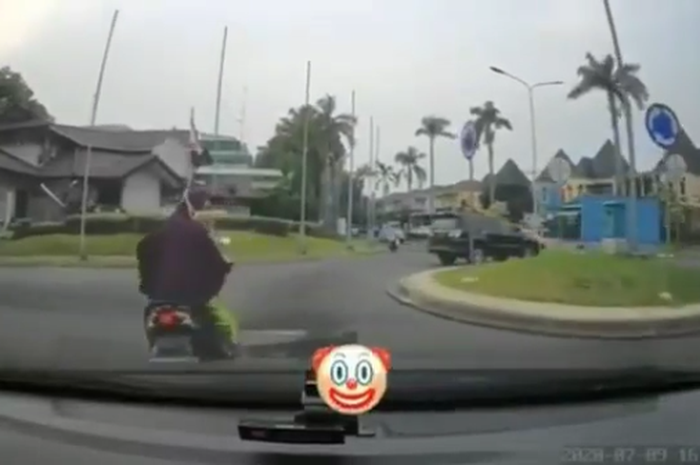 Pada video yang diambil dari rekaman dasbor mobil itu, terlihat seorang emak-emak pemotor tengah melaju di sebuah perumahan.
