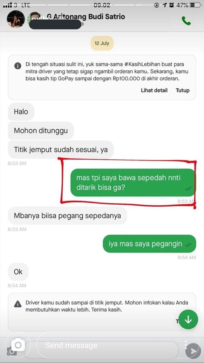 "Akhirnya saya jadi pesan Gojek, karena saya pernah lihat orang naik sepeda pesan ojol terus ditarik," jelas Nova.