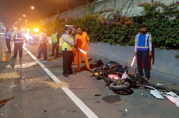 Dalam foto yang disertakan, posisi skutik Honda tersebut terkapar di bahu jalan tol dengan kondisi remuk nyaris tak berbentuk.