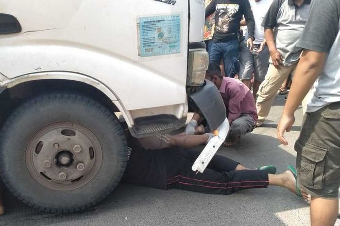 Korban yang merupakan seorang pengendara motor bernama Febrian (29) sempat terseret sejauh 10 meter di dalam kolong truk.