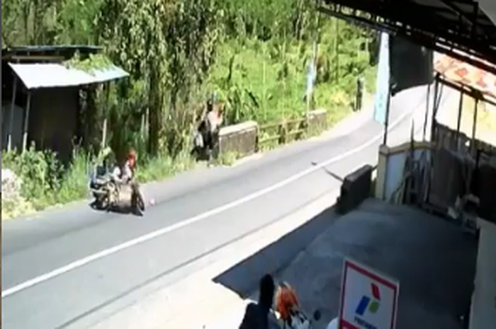 Gridmotor.id - Sebuah kecelakaan motor terekam kamera CCTV, yang menyebabkan pemotor dan boncengernya nyemplung ke dalam sungai.