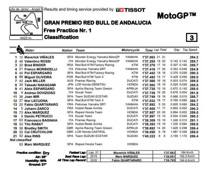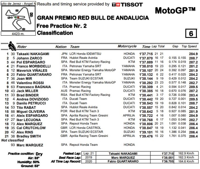 Sedangkan juara dunia MotoGP 2019, Marc Marquez tidak kelihatan hasil catatan waktu FP1 dan FP2.