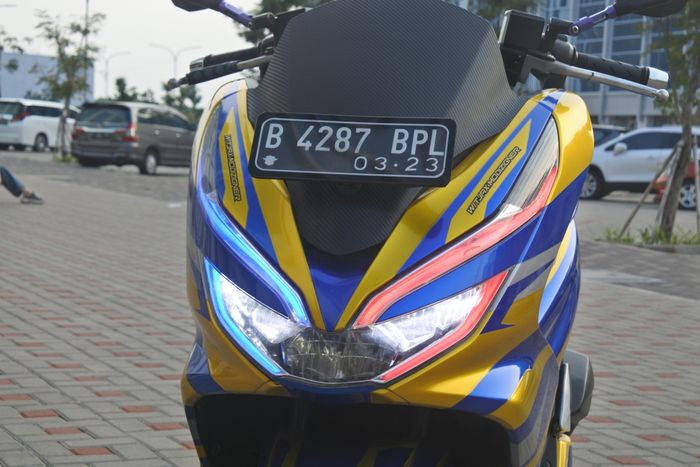 "Iya mas ini bagian DRL-nya saya ganti dengan alis LED yang beda warnanya nih antara kiri sama kanan. Pakai warna biru plus merah, lumayan nyentrik kalau motor dalam keadaan menyala hehe,"