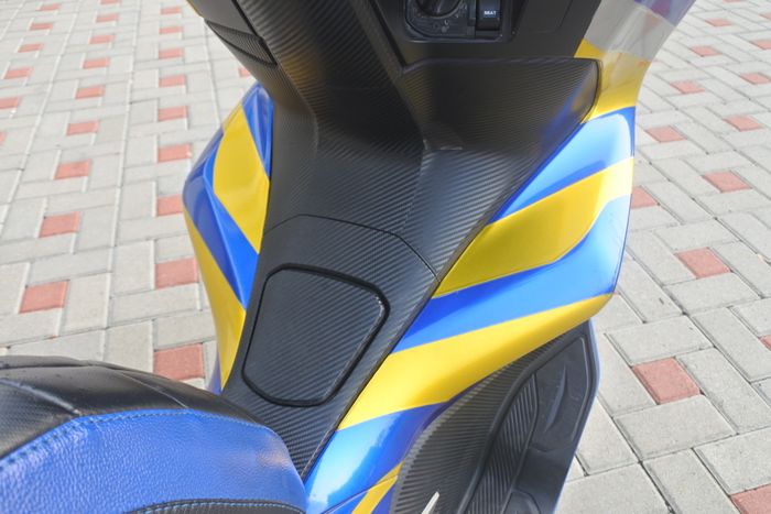"Oh iya biar enggak monoton, di beberapa bagian bodi kasar saya putuskan pakai lapisan carbon. Kaya di bagian dek tengah sama samping dekat pijakan kaki, plus bagian windshield orisinilnya saya lapis carbon," tambahnya.