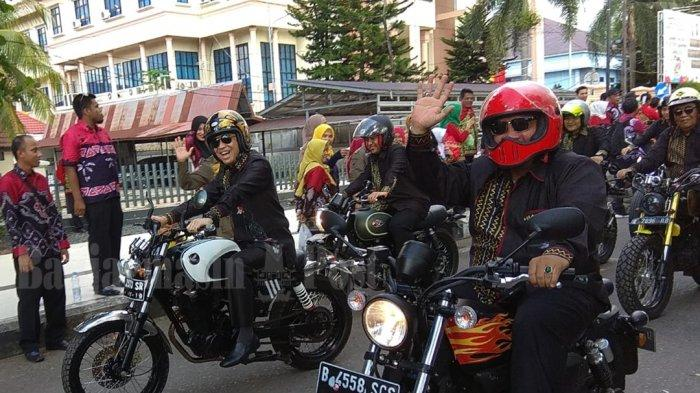 Ia menggunakan motor klasik saat menuju panggung utama kegiatan puncak hari jadi Kota Banjarbaru.