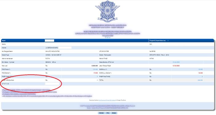 Nah, untuk mengetahui apakah kendaraan tersebut kena tilang elektronik atau tidak bisa lihat kolom STATUS yang berada paling bawah.