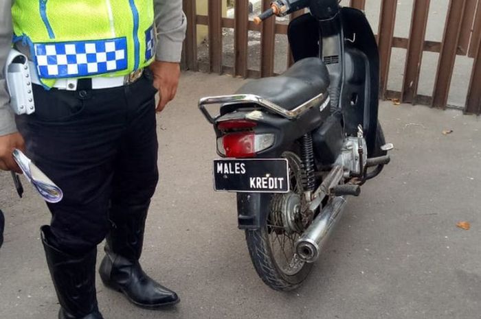 Pemilik motor Honda Astrea keluaran tahun 90-an tersebut, dengan sengaja memasang plat nomor motornya dengan tulisan "Malas Kredit".