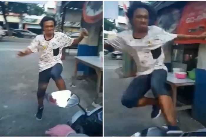 Tukang parkir berkaos putih itu murka sampai menendang motor seorang perempuan.