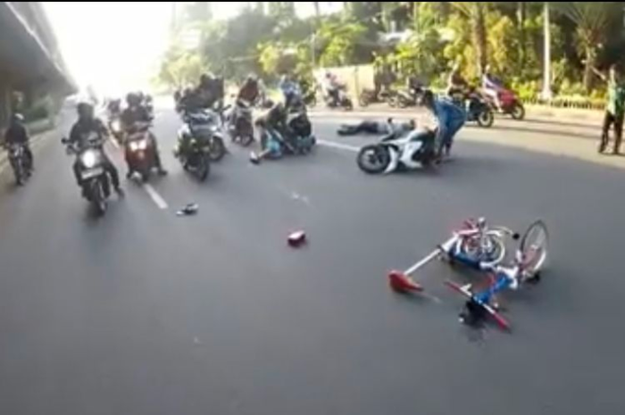 Pengendara kemudian membantu memindahkan pesepeda yang tergeletak di tengah jalan.