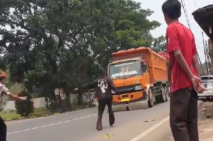 Gridmotor.id- Nyawalu murah tong, viral video bocah cegat truk ingin menumpang, caranya halal ditabrak pemotor ikut kesal.